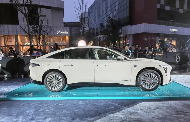 车侧线条以溜背式造型为核心,从A柱顶端自然滑落至车尾,形成兼具动感与优雅的轿跑姿态。侧窗轮廓采用全包覆式无框车门设计,在提升视觉高级感的同时优化了NVH静谧性能。腰线通过多层次曲面勾勒,从前轮拱延伸至尾灯,在光影下形成富有变化的光影流动效果。隐藏式门把手与低风阻轮毂进一步强化了新能源身份,而侧裙处的镀铬饰条与立体折线设计则增添了细节的精致度。尺寸方面,其长宽高分别为5032/1952/1500mm,轴距为3000mm。